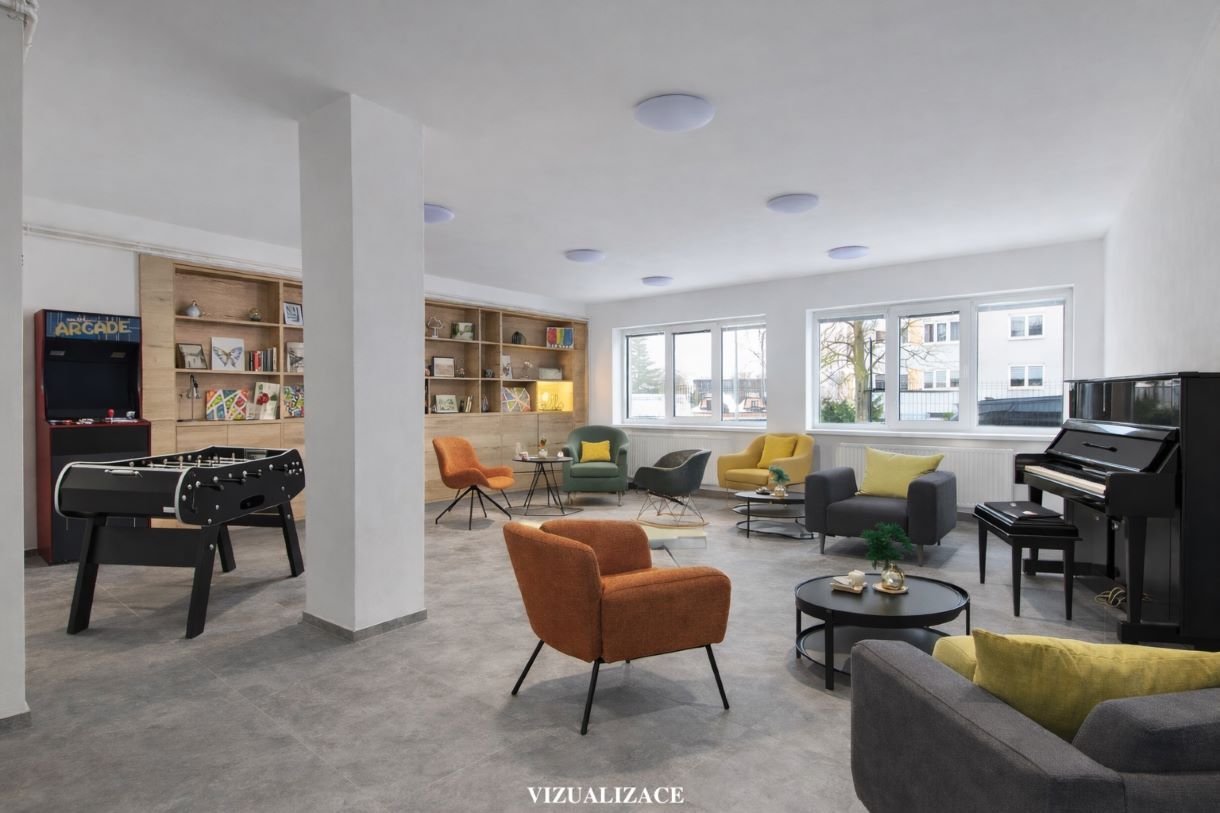 Součástí domu je také společenská místnost, která bude sloužit pro setkávání obyvatel a volnočasové aktivity. Prostor bude vybaven například klavírem a společenskými hrami a nabídne příjemné místo pro trávení volného času.